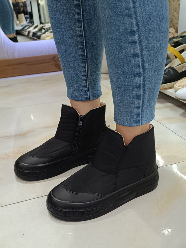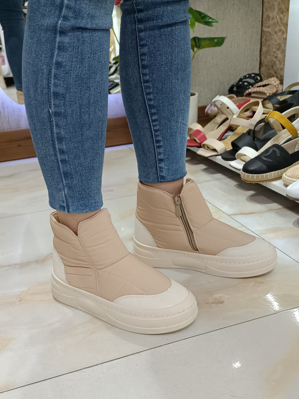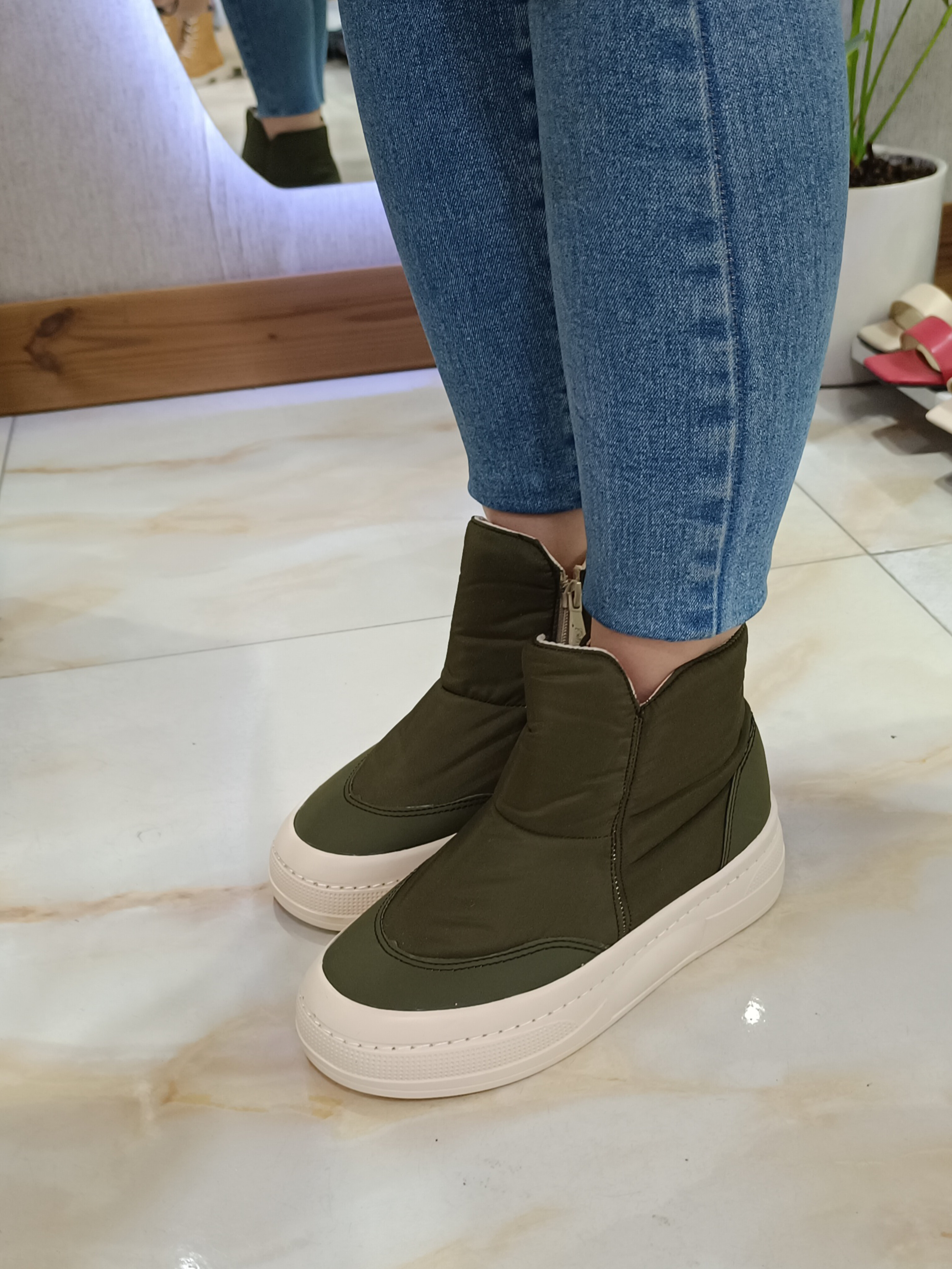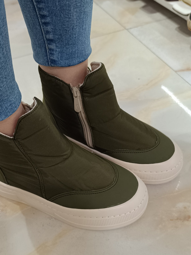 این نیمبوت زنانه با طراحی پفکی (پافر) و اسپرت خود، انتخابی گرم و شیک برای روزهای سرد سال است. رویه آن از جنس برزنت یا پارچه ضدآب ساخته شده که پاها را در برابر سرما و رطوبت محافظت میکند. زیره ضخیم و راحت از نوع PU نرم و درجهیک، عایق مناسبی در برابر زمین سرد فراهم میآورد. این نیمبوت دارای زیپ جانبی برای پوشیدن آسان است. این مدل جذاب علاوه بر رنگ زیتونی موجود در عکس، در رنگهای مشکی و کرمی نیز قابل سفارش است