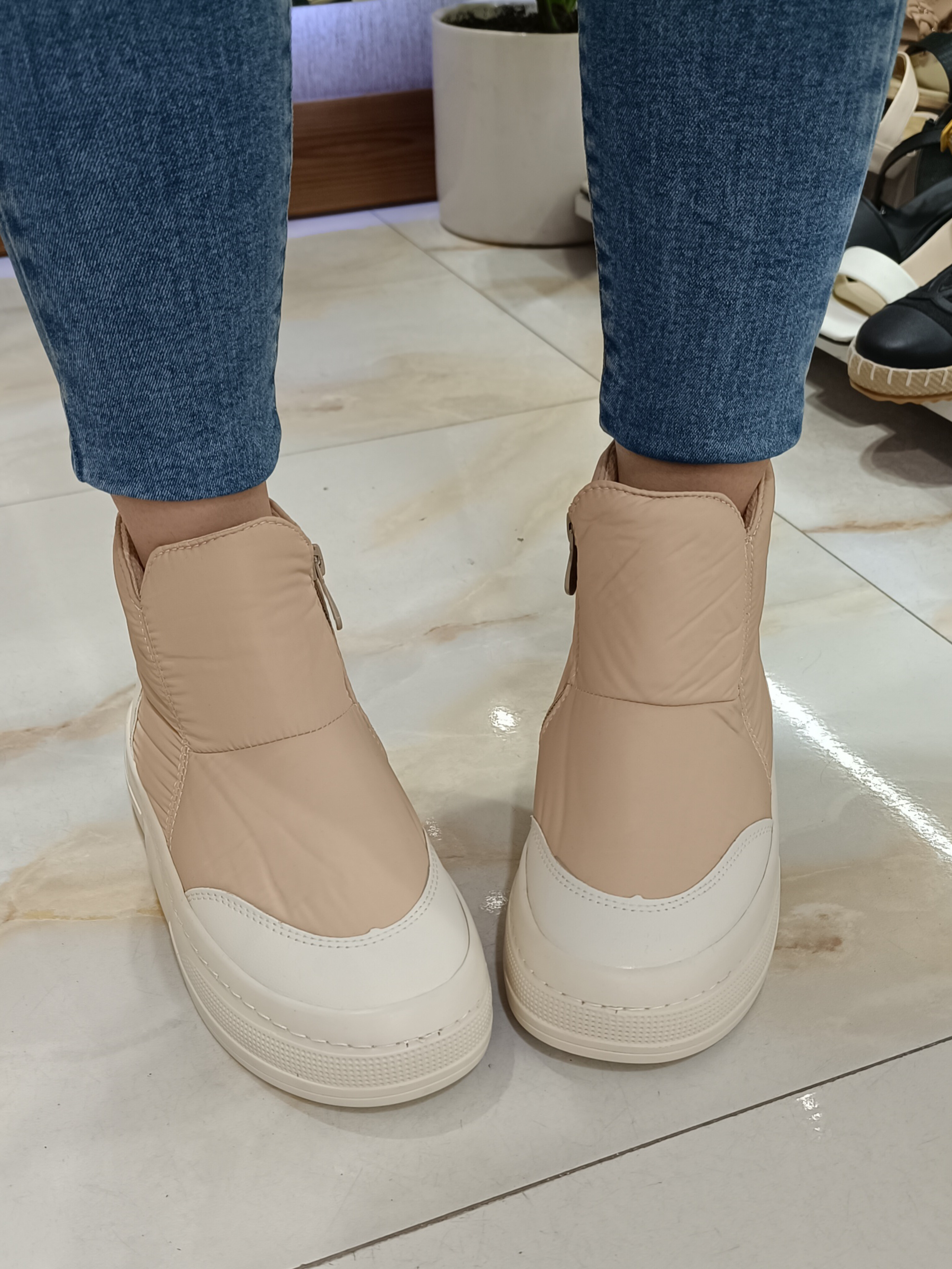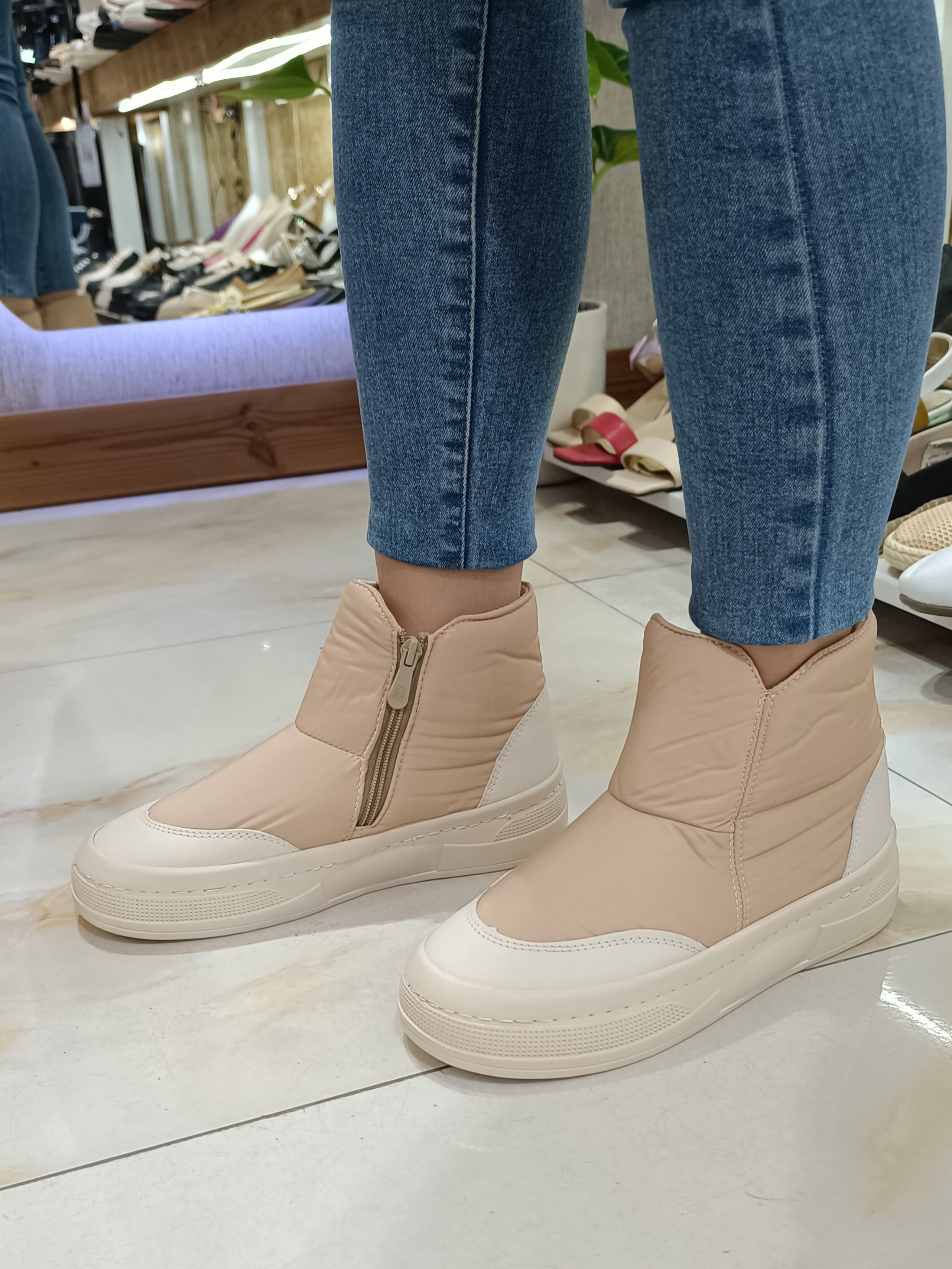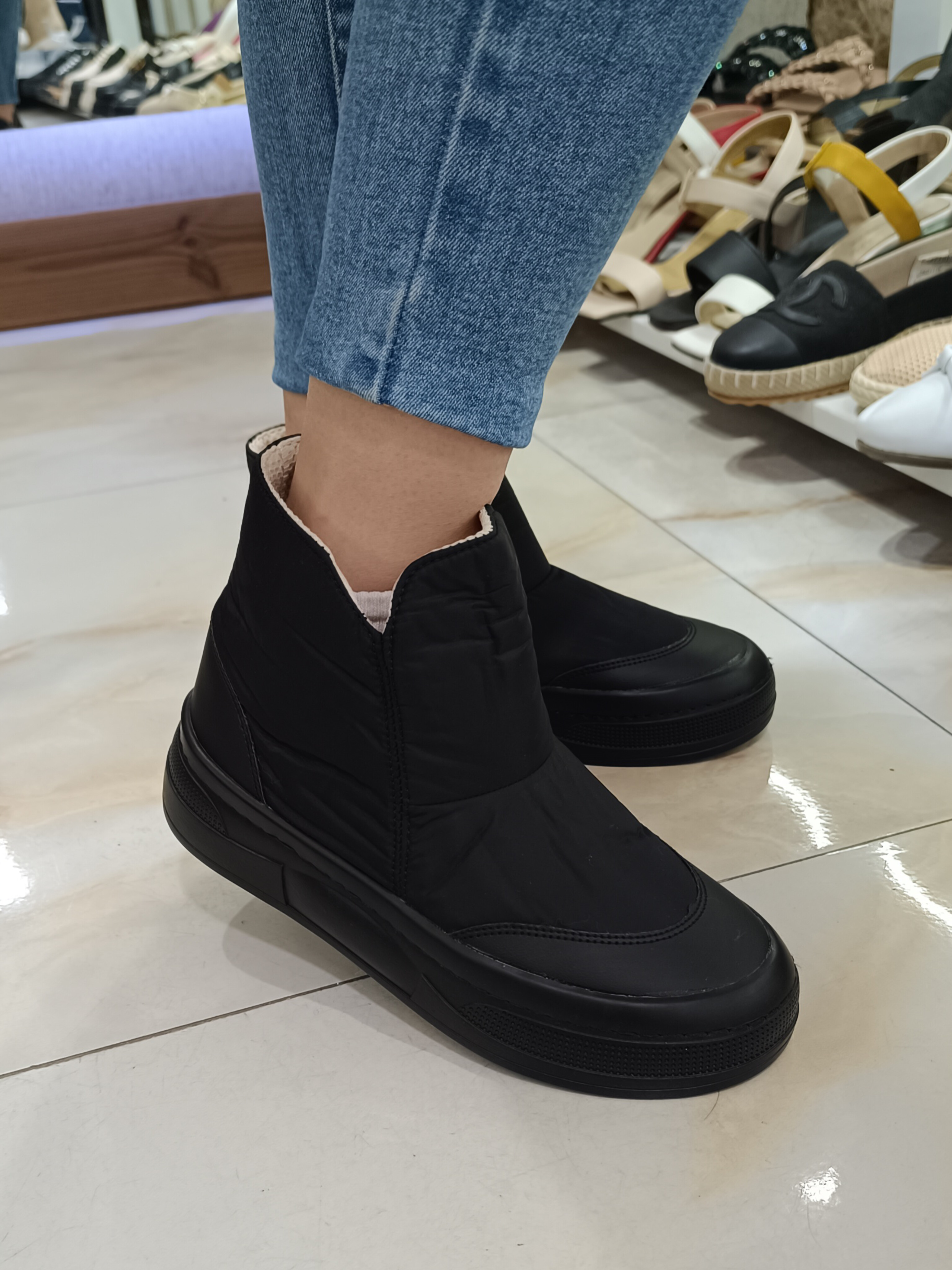 این نیمبوت زنانه با طراحی پفکی (پافر) و اسپرت خود، انتخابی گرم و شیک برای روزهای سرد سال است. رویه آن از جنس برزنت یا پارچه ضدآب ساخته شده که پاها را در برابر سرما و رطوبت محافظت میکند. زیره ضخیم و راحت از نوع PU نرم و درجهیک، عایق مناسبی در برابر زمین سرد فراهم میآورد. این نیمبوت دارای زیپ جانبی برای پوشیدن آسان است. این مدل جذاب علاوه بر رنگ زیتونی موجود در عکس، در رنگهای مشکی و کرمی نیز قابل سفارش است